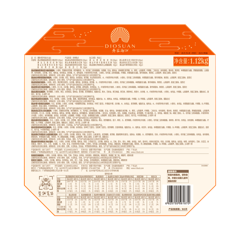 【編 碼】 YBZ2320 【條形碼】 6925755561870 【尺 寸】 25x25x21cm 【凈含量】 1120g 【規 格】 1120gx4盒/箱 【內容物】 100g潮汕雪媚娘蛋黃綠豆沙酥皮餅x1+100g潮汕單叢鴨屎香茶酥皮餅x1+100g潮汕黃皮酥皮餅x1+100g潮汕蛋黃烏豆沙酥皮餅x1+70g潮汕五黑彩虹酥x1+70g潮汕青梅桑椹彩虹酥x1+70g潮汕檸檬卡曼橘彩虹酥x1+70g潮汕粒粒紅豆芝士彩虹酥x1+70g潮汕生椰拿鐵彩虹酥x1+70g潮汕百香果洛神花彩虹酥x1+30g潮汕報春紅殼桃糕點(山楂蔓越莓)x3+30g潮汕金葉黃殼桃糕點(肉松)x3+10g香焙黑芝麻酥x6+10g香焙杏仁酥x6