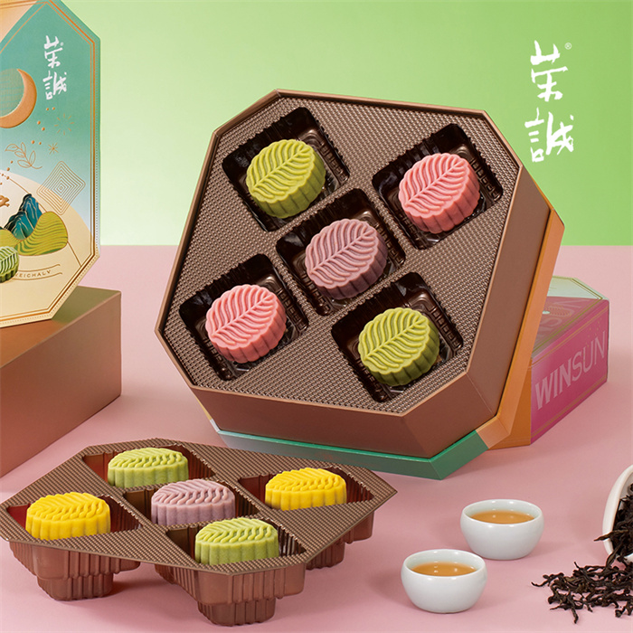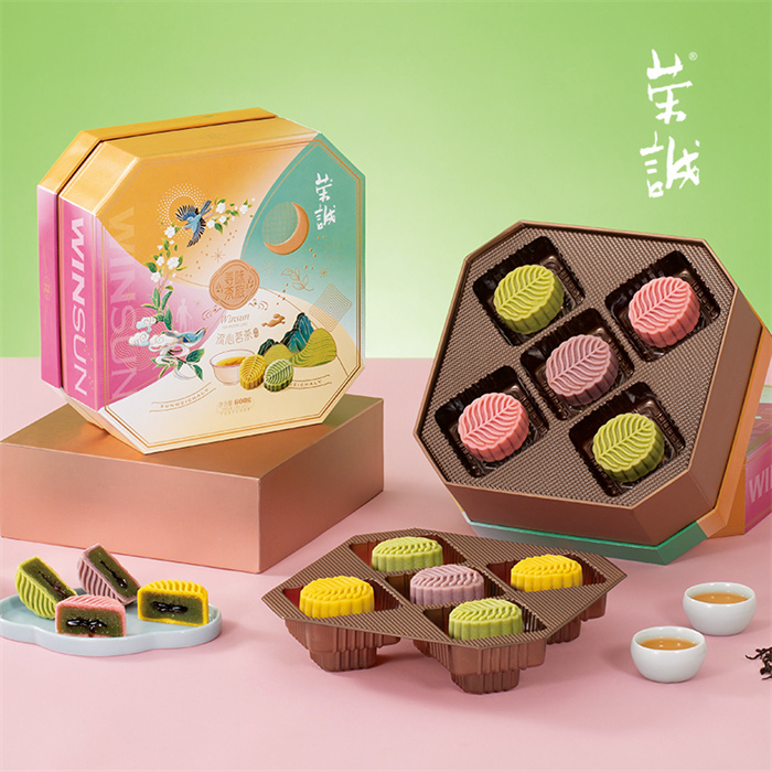 【編 碼】 YBZ2410 【條形碼】 6925755562525 【尺 寸】 24x24x10.3cm 【凈含量】 600g 【規 格】 600gx8盒/箱 【內容物】 60g流心大紅袍茶月餅x2,60g流心單叢茶月餅x2,60g流心紅茶月餅x2,60g流心普洱茶月餅x2,60g流心龍井茶月餅x2